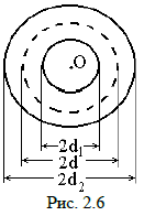 6. Исследовать поле двухслойного сферического конденсатора, у которого радиусы внешнего и внутреннего электродов равны соответственно d2 и d1. Внешний радиус первого слоя d. Относительная диэлектрическая проницаемость первого слоя -ε1, второго -ε2. Приложенное к конденсатору напряжение равно U. Начертить зависимости 𝜑( r ), E( r ) и D( r ). Определить емкость конденсатора и его электрическую энергию (рис. 2.6). Таблица 2.6