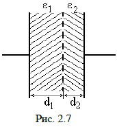 7. Исследовать электрическое поле и определить емкость и энергию плоского конденсатора с двухслойным диэлектриком. Площадь каждой обкладки – S. Приложенное к конденсатору напряжение U=30 В. Принять =0 при x=d1+d2, то есть на левой пластине, x=0 для левой пластины. Начертить кривые зависимости E(x) и D(x). Относительные диэлектрические проницаемости слоев диэлектрика ε1 и ε2. Краевым эффектом пренебречь. Таблица 2.7