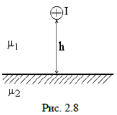 8. Построить картину траектории произвольно выбранной одной силовой линии магнитного поля B , созданного проводником с током, находящимся вблизи ферромагнитной среды. Среда, окружающая проводник с током, характеризуется магнитной проницаемостью 𝜇1=1, относительная магнитная проницаемость ферромагнитной среды - 𝜇2 (рис. 2.8). Таблица 2.8