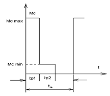 Примечание: Вид движения В – вращательное, П – поступательное При расчете мощности электродвигателя принять наиболее неблагоприятный режим работы. Разработать электропривод следящей системы, обеспечивающей заданную точность слежения механизма при максимальной скорости задающего сигнал и максимальном моменте сопротивления. Датчики положения механизма выбрать, исходя их требуемой точности. В расчетах принять КПД редуктора равным 40 % для червячной передачи. По исходным данным, приведенным в таблице 2.1, необходимо: 1) выбрать тип и рассчитать требуемую мощность электродвигателя с учетом переходных процессов при пуске, торможении и изменении режимов работы двигателя; 2) в соответствии с исходными данными (мощностью, диапазоном регулирования скорости и другими параметрами) выбрать тип преобразователя [4, 5]; 3) разработать принципиальную схему силовой части электропривода; 4) по техническим характеристикам комплектующих электропривода [см. табл. П1 – П4] и принципиальной схеме, рассчитать передаточные функции всех элементов электропривода (электродвигателя, преобразователя и т.д.) и составить его структурную схему; 5) исследовать устойчивость и качество переходных процессов. Электропривод должен обеспечить плавное регулирование скорости механизма. Статистическая погрешность поддержания заданной скорости при изменении момента сопротивления заданном диапазоне не должна превышать заданной скорости во всем диапазоне регулирования. Режим работы механизма – повторно-кратковременный. Расчет мощности двигателя произвести при его работе с максимальным коэффициентом относительной продолжительности включения (εmax) и минимальном времени цикла tц min. Относительная продолжительность включения определяется по выражению (рис.1.1).