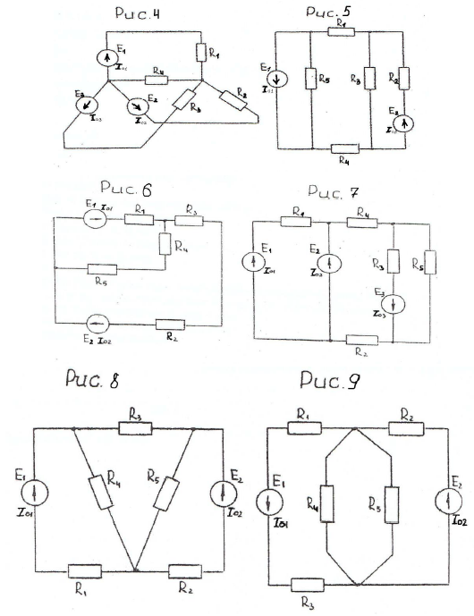 Задание № 3 Для электрической схемы рис. 4 –9, соответствующей номеру варианта рассчитать токи в ветвях. Данные для своего варианта взять из табл. 2. Сравнить результаты вычислений двумя методами, составить уравнение баланса мощностей для электрической цепи своего варианта. Таблица 2