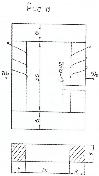Задание № 4 На рисунке 10 показана магнитная цепь с двумя обмотками. Размеры цепи даны в сантиметрах. В цепи имеется воздушный зазор ℓ° = 0,02 см. числа витков обмоток ω1 и ω2 и их соединение (согласное или встречное) заданы. Определить: 1. Силу тока в обмотках для получения заданного магнитного потока Ф или магнитной индукции В. 2. Абсолютную магнитную проницаемость на участие цепи, где расположена обмотка с числом витков ω1. 3. Потокосцепление и индуктивность этой обмотки. Как изменится намагничивающая сила обмотки при отсутствии зазора? Чем это объяснить? Данные для своего варианта взять из табл. 3. Таблица 3
