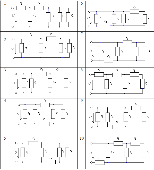 Задача № 1 РАСЧЕТ РАЗВЕТВЛЕННОЙ ЭЛЕКТРИЧЕСКОЙ ЦЕПИ ПОСТОЯННОГО ТОКА С ОДНИМ ИСТОЧНИКОМ ЭЛЕКТРИЧЕСКОЙ ЭНЕРГИИ Для однофазных схем электрической цепи, изображенных на схемах, определить токи и составить баланс мощностей. Значение сопротивлений и напряжение на зажимах цепи приведены в табл. 1. Таблица 1 Напряжения и сопротивления схем электрических цепей (выбираются по последней цифре шифра студенческого билета)
