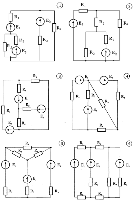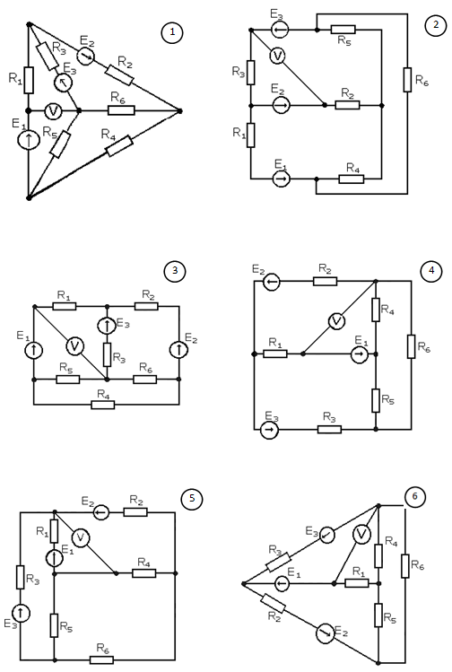 Контрольная работа №1 “Анализ электрических цепей постоянного тока” Указания: номер схемы соответствует порядковому номеру студента в списке своей группы (числовые параметры к схемам находятся в таблицах после схем) Задание: для гр. ЭN-04 (N – две последние цифры года поступления в ВУЗ) 1. Написать по законам Кирхгофа систему уравнений для определения неизвестных токов и э.д.с. в ветвях схемы; решать эту систему уравнений не следует. 2. Определить неизвестные токи и э.д.с. в ветвях схемы методом контурных токов (узловых потенциалов). 3. Составить баланс мощностей для исходной схемы. 4. Определить напряжения, измеряемые вольтметрами. 5. Методом эквивалентного генератора определить ток во второй ветви (где R2 и E2), а также найти величину и направление э.д.с., которую надо дополнительно включить в эту же ветвь, чтобы ток в ней увеличился в два раза и изменил свое направление. 6. Определить входную проводимость второй ветви и взаимную проводимость ветвей второй и третьей (где R3 и E3). 7. Найти уравнение, выражающее зависимость тока в третьей ветви от сопротивления второй при постоянстве всех остальных параметров схемы.