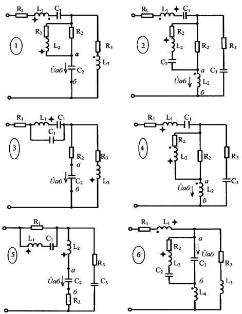 Контрольная работа №2 “Анализ электрических цепей переменного тока” Задание: для гр. ЭN-04 Заданы параметры цепи и напряжение на одном из участков цепи, включенном между точками а-б: Требуется: 1. Определить токи и напряжения на всех участках цепи символическим методом. 2. Записать выражения для мгновенных значений всех токов и напряжений. (временные функции) 3. Сделать проверку правильности решения по законам Кирхгофа. 4. Составить баланс реактивных мощностей. 5. Построить векторные диаграммы напряжения, тока и мощности на входе цепи. (п. 1-5 выполнить без индуктивной связи) 6. Качественно построить векторно-топографическую диаграмму токов и напряжений с учётом индуктивных связей. 7. Записать уравнения по законам Кирхгофа при наличии индуктивных связей между катушками. Числовые данные приведены в табл. 3