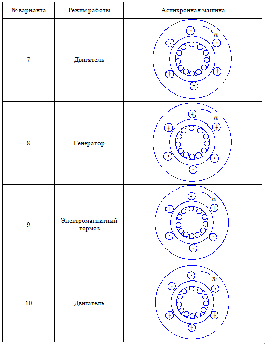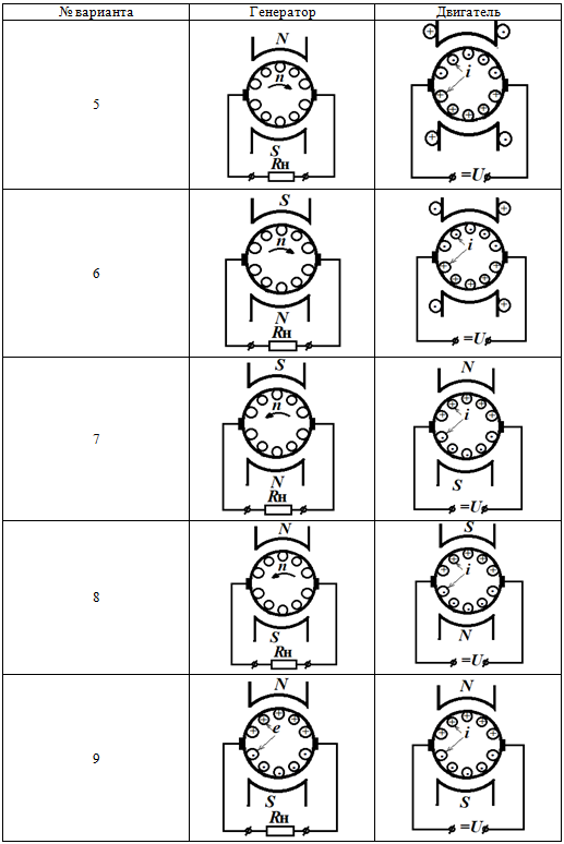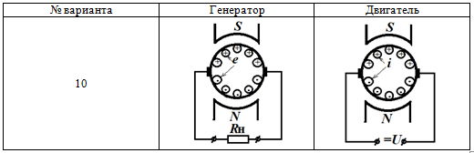 Практическое задание 1 Тема 1. Основные понятия, законы и принципы электромеханического преобразования энергии Задание Изучить электромеханическое преобразование энергии в электрических машинах. Дополните исходные изображения недостающими построениями в соответствии с вариантом задания. На каждом рисунке должны быть обозначены: - полюсы индуктора буквами N и S; - символами «·» или «+» направление ЭДС e и тока i в проводниках якоря; - стрелками направления электромагнитных сил F, действующих на проводники якоря; - направление электромагнитного момента M, приложенного к якорю; - направление вращения якоря n. Выбор варианта задания производится по первой букве фамилии (таблица 1.1 и таблица 1.2). Таблица 1.1 Выбор варианта задания