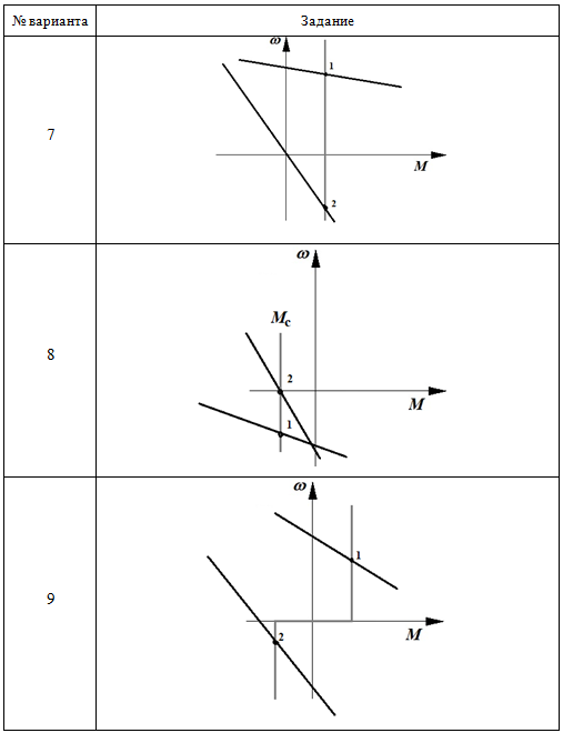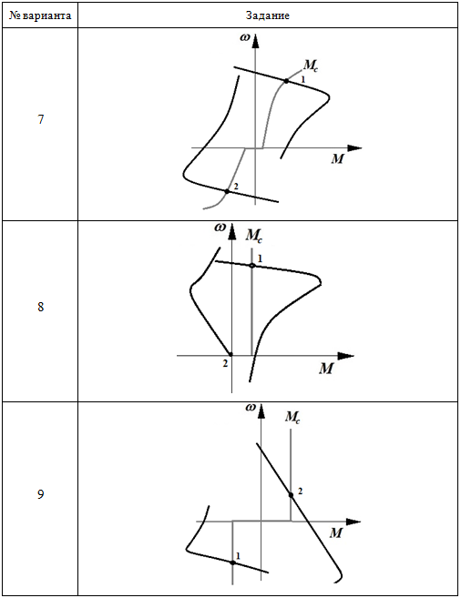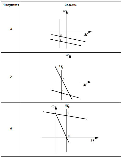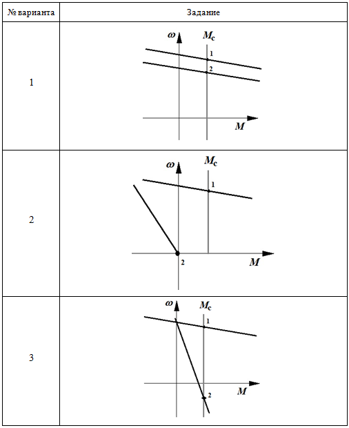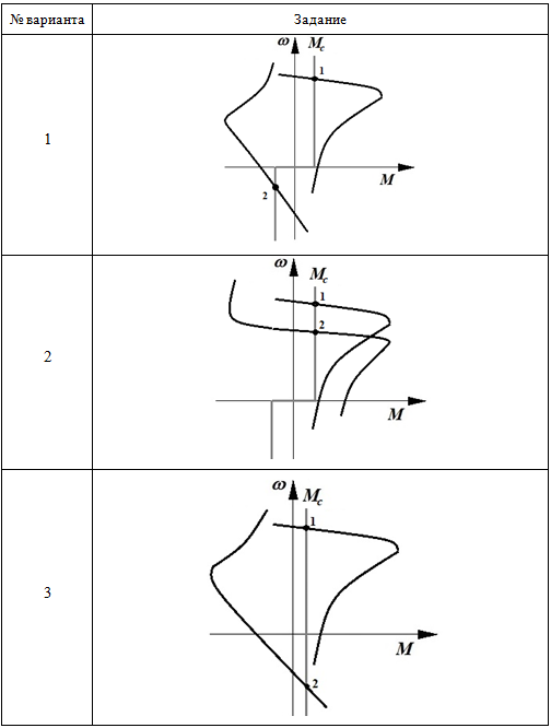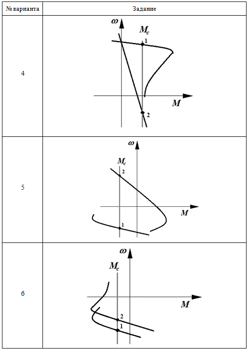 Практическое задание 6 Тема 13. Электропривод с трёхфазным асинхронным двигателем Задание Изучить тормозные режимы работы привода с трёхфазным асинхронным двигателем. 1. Определите режимы работы привода на основе трёхфазного асинхронного двигателя, соответствующие точкам 1 и 2 на заданных механических характеристиках. Проанализируйте механические характеристики и ответьте на вопросы: - Как называется установившийся режим работы привода, соответствующий точке 1? - Как называется установившийся режим работы привода, соответствующий точке 2? - Каким путем двигатель мог быть переведен из одного установившегося режима (точка 1) в другой (точка 2)? 2. Изобразите траекторию, соответствующую переходу электродвигателя из точки 1 в точку 2. 3. Определите в каком режиме работал электродвигатель, в первый момент времени, при переходе из точки 1 в точку 2. 4. Для выполнения задания используйте бланк задания 6. Выбор варианта задания производится по первой букве фамилии (таблица 6.1 и таблицу 6.2). Таблица 6.1 Выбор варианта задания