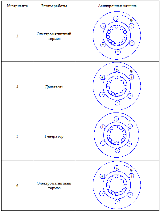Практическое задание 3 Тема 4. Устройство, принцип действия и область применения трёхфазных асинхронных машин Задание Изучить вращающееся магнитное поле и режимы работы трёхфазной асинхронной машины. 1. Изобразите вектор магнитного потока статора асинхронной машины Ф1 для заданных моментов времени t1 и t2 при прямом чередовании фаз обмотки (таблица 3.2). Определите направление вращения («по часовой стрелке» или «против часовой стрелки») поля статора. Затем измените чередование двух заданных фаз обмотки статора. Изобразите вектор Ф1 для момента времени t2. Определите направление вращения поля статора («по часовой стрелке» или «против часовой стрелки») при обратном чередовании фаз трёхфазной обмотки. Сформулируйте правило для определения направления вращения поля при прямом и обратном чередовании фаз обмотки статора. Запишите принцип изменения направления вращения поля статора в трёхфазной асинхронной машине. 2. Изобразите силовые линии магнитного поля статора для заданного направления тока в его обмотках (таблица 3.3). Определите полярность полюсов статора Nc и Sc. Определите направление наведённой в проводниках ротора ЭДС E2 и активной составляющей тока I2a для указанного режима работы асинхронной машины, а также заданного направления вращения поля статора n1. Обозначьте на рисунке направления электромагнитных сил F, момента M и направления вращения ротора n. Вариант задания выбирается по первой букве фамилии (таблица 3.1, таблица 3.2 и таблица 3.3). Таблица 3.1 Выбор варианта