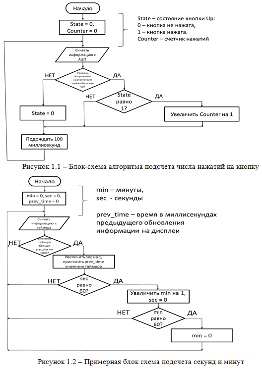 Продемонстрируйте программу и результаты её работы. Как Вы заметили очистка экрана функцией lcd.clear() приводит к мерцанию экрана, поскольку экран физически полностью очищается и лишь, затем происходит вывод очередного текста. Предложите и реализуйте модификацию программы, чтобы устранить мерцание. К пункту 2.6. Работа требуемой программы должна осуществляться следующим образом. При включении устройства на экран выводится число ноль, при нажатии на кнопку Up выводится число один, при дальнейшем её удержании или отпускании ничего не меняется, при повторном нажатии выводится число два и т.д. Предлагается следующий алгоритм, приведенный на рисунке 1.1. После каждого изменения переменной Counter её необходимо отобразить на дисплее. К пункту 2.7. Работа требуемой программы должна осуществляться следующим образом. При включении устройства на экран выводится сообщение 00:00. Формат этого сообщения: минуты : секунды. При нажатии на кнопку Up секундомер запускается, а при повторном нажатии отсчет заканчивается. Нажатием кнопки Down происходит сброс показаний в 00:00. В микроконтроллере Atmega32 присутствуют таймеры и функцией millis() можно узнать количество миллисекунд прошедших с момента включения микроконтроллера: long result = millis(); Предлагается использовать следующий алгоритм, приведенный на рисунке 1.2. Добавьте в алгоритм обработку информации с электронной клавиатуры: сброс и паузу и реализуйте программу. К пункту 2.8. Добавьте в программу, созданную в пункте 2.7 еще одну переменную – час (hour), а также команды её обработку. Реализуйте напрямую возможность изменять значения переменных min и hour нажатием кнопок. Удалите функциональность, связанную со сбросом, запуском и паузой секундомера.