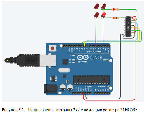 Лабораторная работа №3 «Отображение информации с помощью светодиодных матриц» Указания к выполнению работы Тестовая программа, выполняющая управление матрицей светодиодов 2x2 представлена в листинге 1. Листинг 1 #define ROW_SER 8 #define ROW_RCLK 9 #define ROW_SRCLK 10 void setData(uint8_t data) { digitalWrite(ROW_RCLK, LOW); for (int8_t i = 7; i >= 0; --i) { digitalWrite(ROW_SRCLK, LOW); digitalWrite(ROW_SER, data >> i & 1); digitalWrite(ROW_SRCLK, HIGH); } digitalWrite(ROW_RCLK, HIGH); } void setup() { pinMode(ROW_SER, OUTPUT); pinMode(ROW_RCLK, OUTPUT); pinMode(ROW_SRCLK, OUTPUT); pinMode(2, OUTPUT); pinMode(5, OUTPUT); setData(0b11111101); digitalWrite(2, HIGH); } void loop() { delay(10); } Схема подключения показана на рисунке 3.1.