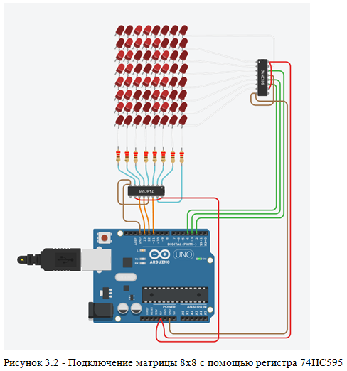 Представленная программа не использует какие-либо сторонние библиотеки кода. Выполнение пункта 2.3 начинается с самостоятельной сборки выполняемой программы из предоставленного исходного текста. Включите в отчет листинг с исходным кодом программы и фото с камеры, полученные Вами и демонстрирующие работу программы. Основную часть пункта 2.3 в отчете должно занимать описание алгоритма работы предоставленной программы в текстовом виде или в виде блок-схемы алгоритма. На рисунке 3.2 показана схема подключения матрицы 8x8.