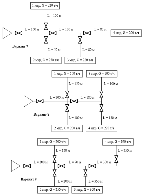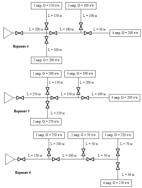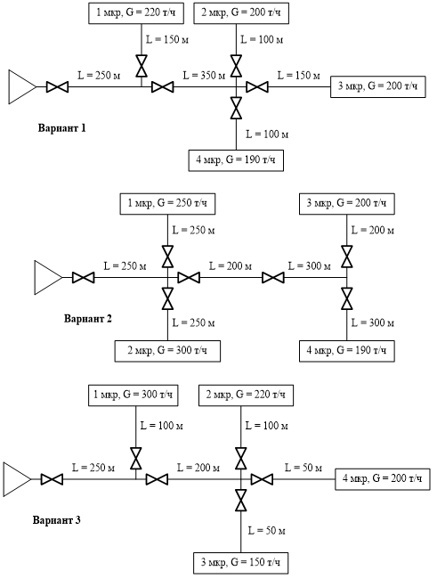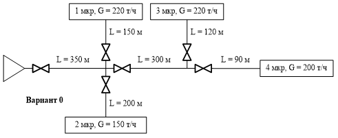 В табл. 1 используются обозначения: dтпр – диаметр теплопровода без изоляции, м; tв – средняя температура теплоносителя на выходе теплового пункта; tн – средняя температура окружающей среды, °С; Δd – толщина изоляции, м; λ1 – теплопроводность единственного слоя изоляции, Вт/(м.°С); w – скорость ветра, м/сек. На рис 3. приведены схемы подключения к тепловой сети нескольких микрорайонов, где – тепловой пункт; G – массовый расход теплоносителя, т/час; L – длина участков, м.