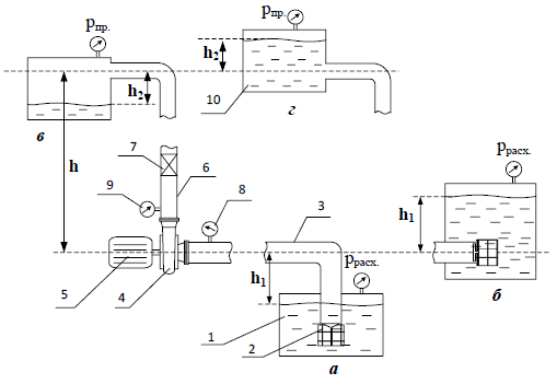 Требуется: 1. обозначить элементы насосной установки (позиции 1 – 10); 2. определить гидравлические потери в трубопроводе (всасывающий + напорный) при заданном расходе воды; 3. подобрать насос для полученных рабочих параметров; 4. оценить КПД насоса при работе в текущем режиме; 5. определить параметры работы насоса (Н, N, КПД) при уменьшении производительности на 20% дросселированием (с помощью регулирующей задвижки), сделать вывод о устойчивости работы насоса в таком режиме.