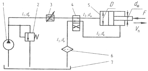 В большинстве случаев гидропривод представляет собой сложный трубопровод с насосной подачей, поэтому его уточненный расчет рекомендуется выполнять графоаналитическим методом. Этот расчет следует проводить для основных установившихся режимов работы гидропривода с целью проверки выполнения им технических требований, приведенных в техническом задании на проектирование. При этом рекомендуется следующая последовательность действий. На первом этапе принятую принципиальную схему гидропривода следует заменить расчетной, в которой отмечается каждое гидравлическое сопротивление (в том числе и гидродвигатели), участвующее в расчете. На этом же этапе полученная схема разбивается на простые трубопроводы (под простым трубопроводом понимается трубопровод без разветвлений). Второй этап заключается в построении характеристики насосной установки в координатах р - Q. На третьем этапе составляются аналитические уравнения потерь для каждого из простых трубопроводов, входящих в расчетную схему. Четвертый этап. На основании полученных на втором этапе аналитических уравнений потерь для каждого из простых трубопроводов, входящих в расчетную схему, на графике строят характеристики простых трубопроводов. Затем, используя правила сложения характеристик простых трубопроводов, получают суммарную характеристику сложного трубопровода. Завершающим действием этого этапа является определение рабочей точки гидросистемы (точки пересечения характеристики насоса и суммарной характеристики сложного трубопровода). Ее координаты используются при расчете потребляемой гидроприводом мощности. Таким образом, в результате уточненного расчета могут быть определены все эксплуатационные параметры гидропривода, характеризующие его работу на наиболее важных установившихся режимах. В случае несоответствия полученных величин техническому заданию необходимо внести коррективы в схему гидропривода или изменить параметры его элементов. ИСХОДНЫЕ ДАННЫЕ На рис. 1 представлена упрощенная схема объемного гидропривода возвратно-поступательного движения. Объемный насос 1 с переливным клапаном 2 образует насосную установку, которая подает рабочую жидкость из бака 7 в гидроцилиндр 5, обеспечивающий движение поршня. Скорость движения поршня Vп регулируется за счет изменения проходного сечения регулируемого гидродросселя 3, а реверс движения достигается за счет гидрораспределителя 4. Для очистки рабочей жидкости в систему включен фильтр 6.