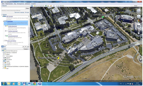 Рис. 1.1 – Окно Google Earth после открытия файла KML_Samples.kml Разметка простой метки на языке KML выглядит следующим образом: <?xml version="1.0" encoding="UTF-8"?> <kml xmlns="http://www.opengis.net/kml/2.2"> <Placemark> <name>Простая метка</name> <description> Привязана к земной поверхности. Приспосабливается к рельефу местности.</description> <Point> <coordinates>-122.0822035425683,37.42228990140251,0</coordinates> </Point> </Placemark> </kml> Рассмотрим структуру этого файла. Заголовок XML: с него начинается каждый KML-файл. Перед заголовком не должно быть никаких символов или пробелов. Декларация пространства имен KML: вторая строка каждого файла формата KML 2.2. Объект Placemark, содержащий следующие элементы: Name – имя, которое используется в качестве ярлыка метки; Description – описание, которое отображается во всплывающем окне, привязанном к метке; Point – координаты, определяющие положение метки на земной поверхности (долгота и широта, иногда также высота). Если Вы не можете найти эту метку на карте, подсказываем: она расположена прямо на 41-м корпусе Google – именно там разрабатывалась программа «Google Планета Земля». То, что пользователи «Google Планета Земля» видят как метку, является элементом <Placemark> с дочерним элементом <Point> в формате KML. Это единственный способ отобразить метку с ярлыком в окне 3D-просмотра. По умолчанию метка имеет вид уже знакомой Вам желтой булавки. В KML-коде элемент <Placemark> может содержать один или несколько базовых векторных элементов, таких как ломаные линии (LineString), многоугольники (Polygon) или модели (Model), но только <Placemark> с дочерним элементом <Point> может отображаться как метка с ярлыком. Элемент <Point> служит для правильного размещения метки на карте, но сам не имеет графического представления. Описательный HTML в метках. В файле KML_Samples.kml приведены исчерпывающие примеры форматирования текста метки, включая добавление ссылок, изменение размера и стиля шрифта, выравнивание и использование таблиц. Чтобы просмотреть полный список возможностей, скопируйте и вставьте в текстовый редактор пример Descriptive HTML (в папке Styles and Markup). Для выделения кликните правой кнопкой мыши на имени данной папки и выберите операцию копирования. Этот файл (так же, как файл HTML) можно создать в любом текстовом редакторе (например, в стандартном приложении «Блокнот»). Если Вы будете создавать его самостоятельно, то не забудьте сохранить текст в формате Unicode, иначе русские буквы в программе «Google Планета Земля» будут отображаться некорректно. Расширение имени файла, как нетрудно понять, должно быть kml. Авторазметка в «Google Планета Земля 4.0» и более поздних версиях. В «Google Планета Земля» предусмотрена функция авторазметки, которая преобразует текст наподобие www.google.com в активные гиперссылки. Текст, заключенный в теги <description> или <Snippet>, а также в элемент <text> внутри <BalloonStyle>, автоматически преобразуется в стандартные HTTP-ссылки. Добавлять теги <a href= ...> вручную не нужно. Использование элемента CDATA. Чтобы добавить стандартный HTML-код в элемент <description>, его необходимо заключить в тег CDATA. Если этого не сделать, угловые скобки придется записывать в виде ссылок на объекты, иначе HTML-код будет неправильно анализироваться (например, символ >потребуется писать как >, а символ < – как <). Это особенность языка XML в целом, а не только в «Google Планета Земля». Обратите внимание на HTML-разметку с тегами CDATA и без них.