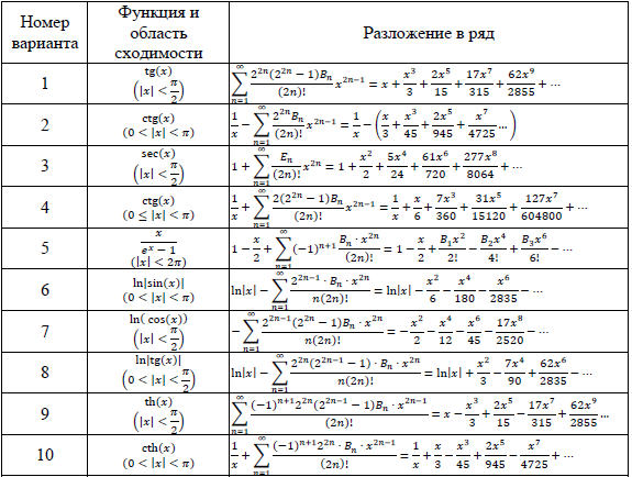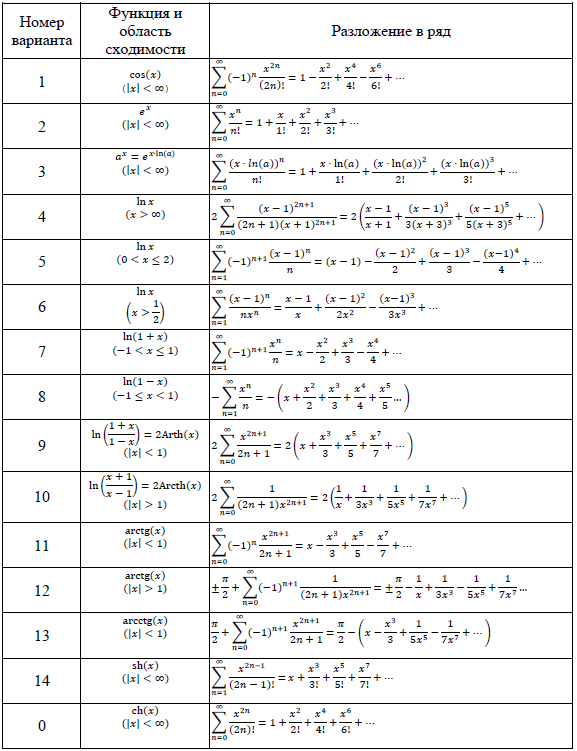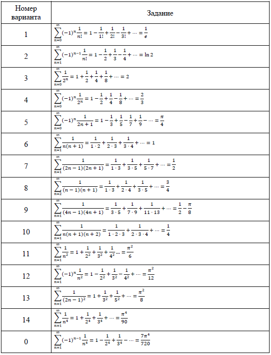 Лабораторная работа 2 ЦИКЛЫ Ц е л ь р а б о т ы: овладение навыками построения простых и вложенных циклов, повторение основных форм записи циклов на языке С. Задание к работе На выполнение заданий вместе с защитой отводится три пары. 1) Посчитать сумму ряда, ограничивая число элементов ряда первым элементом, меньшим заданной величины eps. Определить реальную точность ряда. 2) Реализовать функцию, ограничивая число элементов ряда первым элементом, меньшим заданной величины eps. Рассчитать 10 значений из области сходимости. Номер варианта в предыдущих двух заданиях определяется как остаток от деления номера по журналу на 15. Наряду с типовыми заданиями предлагаются задания повышенной сложности. 3) Решить задачу с помощью цикла. Номер задания определяется остатком от деления варианта на восемь. 0. Найти в массиве символов наиболее длинную последовательность подряд идущих символов. 1. Найти в массиве целых чисел наиболее длинную возрастающую последовательность. 2. Найти в массиве символов количество последовательностей, содержащих три подряд одинаковых символа. 3. Найти в массиве символов среднюю длину последовательностей из двух и более символов. 4. Найти в массиве символов последовательность из n подряд одинаковых символов. 5. Найти в массиве чисел количество локальных максимумов (чисел, которые больше соседних элементов). 6. Найти в массиве чисел количество локальных минимумов (чисел, которые меньше соседних элементов). 7. Найти в массиве чисел количество чисел, больших предыдущих элементов массива. Значение величины eps – 0,01. Содержание отчета Отчет должен содержать листинг программы, в которой реализованы задание и функции тестирования, представлены результаты работы программы. Контрольные вопросы 1) Запишите в общем виде цикл в форме for. 2) Запишите в общем виде цикл в форме while. 3) Запишите цикл, подсчитывающий сумму элементов массива целых чисел во всех формах записи циклов на языке С. 4) Запишите цикл, находящий максимальный элемент массива целых чисел во всех формах записи циклов на языке С. 5) Что такое инвариант, предусловие и постусловие цикла? 6) Как правильно построить тело цикла? 7) Как связаны между собой постусловие, условие окончания и условие выполнения цикла? Таблица 2.1 Варианты к первому заданию