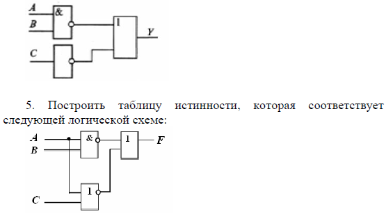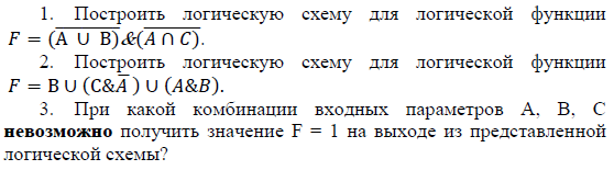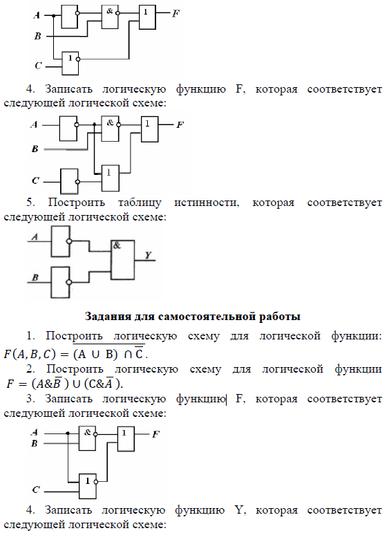 ЧАСТЬ 3 . ОСНОВНЫЕ ПОНЯТИЯ АЛГЕБРЫ ЛОГИКИ Задание для третьей части контрольной работы 1. Выполнить подстановку операции так, чтобы равенство (1 AND 0) ___1 = 0 оказалось верным. 2. При каких значениях A, B, C выполняется равенство (A AND C) AND (B OR C) = 1? 3. При каких значениях A, B выполняется равенство (NOT B) AND A = 1? 4. Для какого значения X логическое выражение ¬ ((X > 2) → (X > 3)) будет истинно? 5. Какое из приведенных высказываний является тождественно истинным? а) A ∧ (A → B) б) A → B в) A → ((A ∧ B) ∨ A) г) (A ∨ B) → A 6. При каких значениях переменных K, L, M, N логическое выражение (¬(M ∨ L) ∧ K) →(¬ (K ∧ ¬M) ∨ N) будет ложным? 7. Записать логическое выражение для высказывания: точка X принадлежит одному из отрезков [A; B] или [C; D]. 8. Построить таблицу истинности для логического выражения x→(𝑥̅̅ &̅̅̅ 𝑦̅̅). 9. С помощью таблицы истинности установить, равносильны ли следующие логические выражения: X∨ (Y → Z) и (X ∨ Y) → (X ∨ Z). 10. Какое из приведенных выражений соответствует заданной таблице истинности?