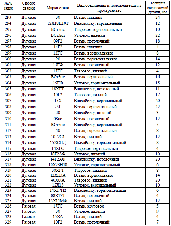 293–356 решить задачи. Для решения задач: 1. Расшифруйте марки заданных материалов. 2. Оцените свариваемость материала. 3. Опишите процессы, происходящие в зоне шва и околошовной зоне. 4. Опишите особенности технологии и техники сварки данного материала. 5. Выберите и обоснуйте метод сварки. 6. Произведите расчёт режимов, подготовку кромок шва, выберите оборудование для сварки с указанием основных характеристик. 7. Выберите и опишите методы контроля сварного соединения. Перечень вариантов приведён в таблице 4. Таблица 4 – Исходные данные для решения задач с № 293 по №356