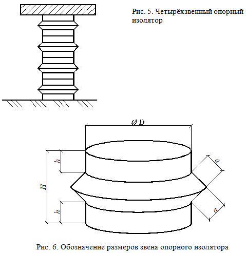 Медная шина прямоугольного сечения отделена от корпуса опорным изолятором (см. рис. 5). Материал, размеры (см. рис. 6) и количество N (шт) звеньев опорного изолятора принять в соответствии с вариантом по таблицам 1.1 и 1.2. Определить объёмное RV и поверхностное RS сопротивления изолятора, объемный IV и поверхностный IS токи при напряжении U ( В) постоянного тока. Технические параметры диэлектриков принять по приложению 1.