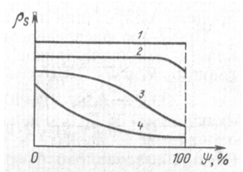 Рисунок 4 81. Пространство между пластинами плоского конденсатора заполнено жидким диэлектриком с диэлектрической проницаемостью e1, в котором во взвешенном состоянии находится шар из твердого диэлектрика с диэлектрической проницаемостью e2. Изобразите картину силовых линий электрического поля в конденсаторе для двух случаев: а) e1 < e2; б) e1 > e2. 82. Капельки воды находятся во взвешенном состоянии в трансформаторном масле. Что с ними произойдет, если масло поместить в постоянное электрическое поле? 83. В каких единицах выражается удельное объемное и удельное поверхностное сопротивление диэлектриков? Почему их экспериментальное определение проводят при постоянном, а не при переменном напряжении, а также через 1 минуту после подачи напряжения на диэлектрик? 84. Удельное объемное сопротивление диэлектрика экспоненциально зависит от температуры: rv = A*exp (W/kT), где W – энергия активации диэлектрика, A и k – постоянные. Определите температурный коэффициент удельного сопротивления диэлектрика. 85. Почему в диэлектриках не обнаруживается эффект Холла? 86. Как объяснить, что неполярные диэлектрики обладают гидрофобными свойствами? 87. При каких условиях для электроизоляционных материалов соблюдается закон Ома? 88. На рисунке 5 показаны зависимости (качественно) удельного поверхностного сопротивления rs от относительной влажности воздуха y для четырех различных диэлектриков: а) не смачиваемого водой и не растворимого в ней; б) пористого; в) плотного, смачиваемого водой и частично растворимого в ней; г) смачиваемого водой, но не растворимого в ней. Указать, какой вид зависимости характерен для каждого из перечисленных диэлектриков и почему.