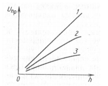 Рисунок 6 97. Почему электрическая прочность твердых диэлектриков больше, чем жидких, а жидких – больше, чем газообразных? 98. Одинаково ли будет изменяться пробивное напряжение воздуха, если производить его нагревание: а) при постоянном давлении; б) при постоянном объеме? 99. Почему ударная ионизация молекул газа в сильном электрическом поле производится главным образом электронами, а не ионами? 100. Как влияет давление газа на его электрическую прочность и ионизационные потери? 101. Чем отличается пробой газа в однородном и неоднородном электрическом поле? Почему при увеличении расстояния между электродами пробивное напряжение газа в однородном поле возрастает? 102. Почему более толстые слои диэлектриков, как правило, имеют меньшую электрическую прочность? 103. Как и почему изменится пробивное напряжение воздуха при нормальном атмосферном давлении, если температуру повысить от 20 до 100 0С? 104. Изобразите графически зависимости напряжения пробоя воздуха от расстояния между электродами при постоянном давлении. Как изменится вид графика, если давление станет меньше первоначального? 105. Изобразите графически зависимость напряжения пробоя газа от давления при различных расстояниях между электродами. 106. Для трех диэлектрических материалов при испытаниях в однородном электрическом поле получены приведенные на рисунке 7 зависимости пробивного напряжения от толщины. Постройте (качественно) в одной системе координат зависимости электрической прочности этих материалов от толщины.