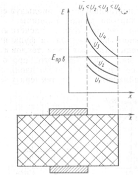 Рисунок 10 При отношении удельных проводимостей слоев γ1/γ2 = 3 каким должно быть отношение диэлектрических проницаемостей слоев, чтобы дополнительные диэлектрические потери не возникали? 119. На рисунке 11 показано распределение напряженности электрического поля вблизи поверхности диэлектрика плоского конденсатора, площадь обкладок которого меньше площади диэлектрической пластины, для различных значений напряжения на обкладках (U1 < U2 < U3 < U4), а также пробивная напряженность для воздуха Епр. возд. При каком значении напряжения произойдет поверхностный пробой? 120. На рисунке 11 показано распределение напряженности электрического поля вблизи поверхности диэлектрика плоского конденсатора, площадь обкладок которого меньше площади диэлектрической пластины, для различных значений напряжения на обкладках (U1 < U2 < U3 < U4), а также пробивная напряженность для воздуха Епр. возд. При каком значении напряжения появятся дополнительные потери, связанные с ионизацией воздуха?