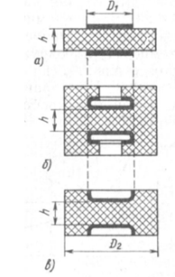 Рисунок 11 121. На рисунке 11 показано распределение напряженности электрического поля вблизи поверхности диэлектрика плоского конденсатора, площадь обкладок которого меньше площади диэлектрической пластины, для различных значений напряжения на обкладках (U1 < U2 < U3 < U4), а также пробивная напряженность для воздуха Епр. возд. Изобразите (качественно) в диэлектрике силовые линии электрического поля и линии равного потенциала. 122. На рисунке 12 показаны сечения трех дисковых керамических конденсаторов, изготовленных из одного материала. Значения D1, D2 и h для всех конденсаторов одинаковы. Для какой конструкции напряжение поверхностного пробоя максимально? 123. На рисунке 12 показаны сечения трех дисковых керамических конденсаторов, изготовленных из одного материала. Значения D1, D2 и h для всех конденсаторов одинаковы. Будут ли отличаться их емкости? 124. В полярном диэлектрике присутствуют дипольные потери и потери на электропроводность. Нарисуйте (качественно) график зависимости суммарных потерь от частоты.