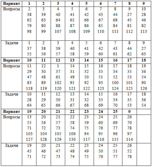 Контрольное задание включает вопросы и задачи по трем основным разделам курса: проводники, полупроводники и диэлектрики. Оно состоит из двух частей: ответы на теоретические вопросы и решение задач. Вариант выбирается следующим образом: - для студентов заочного факультета по двум последним цифрам номера зачетной книжки (личного шифра) студента; если эти цифры составляют число больше 25, то выбор варианта производится по сумме двух последних цифр, например, если номер зачетной книжки 20038, выполняется вариант 11; если номер заканчивается на 00, выполняется вариант 0; - для студентов очной формы обучения вариант выбирается по аналогичной схеме, но вместо номера зачетной книжки используется номер в списке группы. Номера заданий для каждого варианта приведены в таблице 1. Ответы на теоретические вопросы должны быть краткими, но аргументированными, содержать необходимые иллюстрации и формулы. При решении задач необходимо указать все используемые расчетные формулы и привести промежуточные расчеты. Вопрос и условие задачи должны быть обязательно переписаны. Основные расчетные формулы и значения некоторых физических констант приведены в конце данного учебно-методического пособия. Недостающая информация может быть найдена в рекомендуемой литературе, а также в любых других доступных источниках. При этом в контрольной работе обязательно должна быть ссылка на используемую литературу. Работы принимаются на проверку только в рукописном виде. На титульном листе обязательно должен быть указан учебный шифр (для заочников) и вариант. Если работа оформлена с нарушением перечисленных требований, она приниматься на проверку не будет. Таблица 1 – Варианты заданий