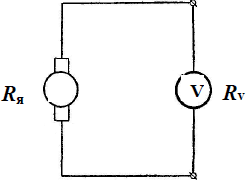 Рис.2.3. Схема измерения ЭДС генератора 3. С помощью амперметра с внутренним сопротивлением RА измерено значение тока, протекающего через резистор R, подключенный к источнику напряжения с внутренним сопротивлением Ri. Определить относительную систематическую погрешность δI измерения тока, вызванную сопротивлением амперметра. 4. Амперметр сопротивлением RА=0,01 Ом и вольтметр сопротивлением RV=25 Ом применяются в схеме для измерения сопротивления якоря электродвигателя. Составить схему измерения методом амперметра и вольтметра, а также определить приближенное и точное значение сопротивления и относительную погрешность, допускаемую при определении сопротивления по приближенной формуле, если наиболее вероятные значения тока и напряжения, полученные в результате повторных измерений, следующие: I=8,5 A , U=1,25 В. 5. Определить относительную погрешность измерения сопротивления последовательной обмотки возбуждения электродвигателя, если ток I=1,1 A, напряжение U=33 мВ, сопротивление амперметра 0,1 Ом, милливольтметра 10 Ом. Составить схему измерения. 6. Для измерения сопротивления R=200 Ом используются амперметр сопротивлением RА=0,05 Ом, вольтметр сопротивлением RV=10 кОм. Какая из двух схем (рис.2.4,а и б) измерения сопротивления методом амперметра и вольтметра дает меньшую погрешность измерения?