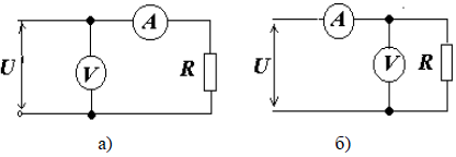 Рис.2.4. Схема измерения сопротивления 7. Для определения ЭДС генератора к его зажимам присоединен вольтметр сопротивлением Rv= 1200 Ом. Внутреннее сопротивление генератора Rя= 0,6 Ом. Какую ошибку мы допускаем, считая показание вольтметра равным ЭДС генератора? 8. При измерении напряжения на нагрузке сопротивлением 7 Ом вольтметр показал 13,5 В. ЭДС источника Е=14,2 В, а его внутреннее сопротивление R0=0,1 Ом. Определить абсолютную и относительную погрешности измерения. 9. По схеме амперметра и вольтметра измеряется сопротивление нагрузки RН. За измеренное значение принимается сопротивление, найденное по закону Ома. Определить, какая из схем дает большую погрешность, если известно, что ток IН= 5 А, напряжение UН=120 В, RV=20 кОм, RА=0,01 Ом. Составить схемы измерения. 10. При измерении сопротивления обмотки якоря методом амперметра и вольтметра применяемые приборы имели следующие показания: амперметр с пределом измерения 0,75 А - 90 делении; вольтметр с пределом измерения 7,5 В и сопротивлением 2,5 кОм - 113,5 делений. Шкалы обоих приборов имеют 150 делений. Составить схему измерения и определить сопротивление якоря. 11. В лаборатории при измерении двух сопротивлений методом амперметра и вольтметра применены: миллиамперметр с сопротивлением 10 Ом; вольтметр с сопротивлением 400 Ом. Показания приборов по схеме (рис.2.4,а) при измерении первого сопротивления были U1=0,7 В, I1=50 мА, а при измерении второго сопротивления соответствующие измерения дали U2=1,32 В, I2=26,5 мА; Определить значения сопротивлений и относительную погрешность измерения. 12. В лаборатории при измерении двух сопротивлений методом амперметра и вольтметра применены: миллиамперметр с сопротивлением 10 Ом; вольтметр с сопротивлением 400 Ом. Показания приборов по схеме (рис.2.4,б) U1=0,2 В, U2=1,05 В, токи I1=50 мА, I2=29 мА. Определить значения сопротивлений и относительную погрешность измерения.