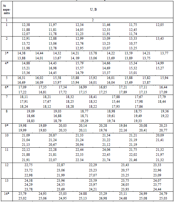 7. ПРЯМЫЕ ОДНОКРАТНЫЕ ИЗМЕРЕНИЯ Задача Необходимо измерить напряжение постоянного тока на выходе активного двухполюсника в режиме холостого хода. Используя данные, приведенные в таблице 7.1, оценить погрешность результата однократного измерения напряжения U на сопротивлении R, учитывая дополнительную температурную погрешность. В соответствии с ГОСТом 22261-82 дополнительная температурная погрешность для данного типа приборов не превышает основной при изменении температуры на каждые 10ºС. Таблица 7.1 Результаты измерений