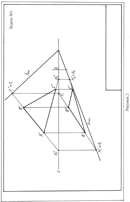 Студенты со сроком обучения 5 лет выполняют все задачи приведенные ниже, а студенты со сроком обучения 4 года не выполняют задачи №№ 5 и 8. Номер варианта соответствует сумме двух последних цифр зачетной книжки. Например, если учебный шифр студента 17-375, то по всем задачам контрольных работ он выполняет двенадцатый (7+5=12) вариант задания. Содержание контрольной работы Задача 1. Построить следы плоскости, заданной треугольником АВС. Формат А3. Задача 2. Построить линию пересечения плоскостей, заданных треугольниками АВС и DEK и показать видимость их проекций. Формат А3. Задача 3. Построить проекции пирамиды, основанием которой является треугольник АВС, а ребро SA определяет высоту h пирамиды. Формат А3 вместе с задачей 4. Задача 4. Построить линию пересечения пирамиды с прямой призмой. Задача 5. Построить линию пересечения конуса вращения плоскостью АВС. Формат А3 вместе с задачей 6. Задача 6. Построить линию пересечения конуса вращения с цилиндром вращения. Задача 7. Построить линию пересечения закрытого тора с поверхностью наклонного цилиндра вращения. Формат А4. Задача 8. Построить линию пересечения открытого тора с поверхностью конуса вращения. Формат А4. Пояснения к выполнению задач Задача 1. По координатам точек из приложения А строятся фронтальная и горизонтальная проекции треугольника АВС. Следы плоскости, заданной треугольником АВС, определяются по следам двух любых сторон треугольника. Следом прямой называется точка пересечения прямой с плоскостью проекций. Фронтальный след F прямой определяется по его горизонтальной проекции F’, которая определяется как точка пересечения горизонтальной проекции прямой с осью x. Горизонтальный след Н прямой определяется по его фронтальной проекции Н”, которая определяется как точка пересечения фронтальной проекции прямой с осью x. Каждый след плоскости строится по двум точкам. Пример выполнения задачи 1 приведен на рисунке 2.