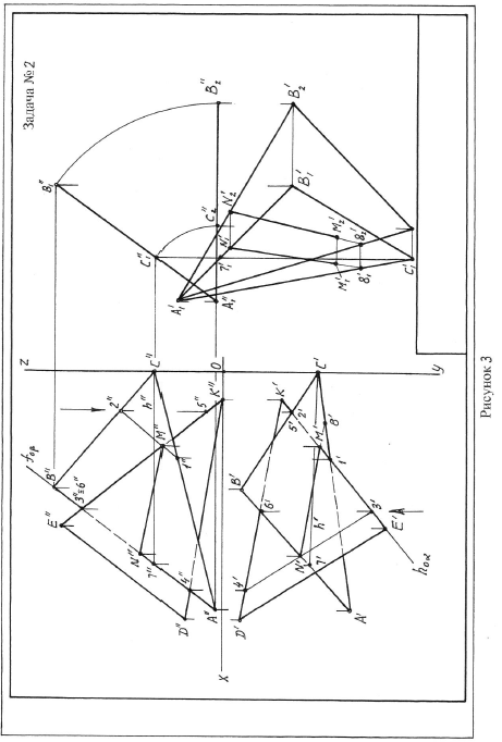 Задача 2. По координатам точек из приложения А строятся проекции треугольников АВС и DEK. Линия пересечения двух плоскостей, заданных треугольниками АВС и DEK, строится по двум точкам. Для этого определяются точки пересечения двух любых сторон одного треугольника с другим треугольником. Для определения точки пересечения прямой с плоскостью заключается эта прямая в проецирующую плоскость, строятся проекции линии пересечения проецирующей плоскости с треугольником. Точка пересечения этой линии с прямой, заключѐнной в проецирующую плоскость, и есть точка пересечения прямой с треугольником. Аналогично определяется вторая точка. Видимость сторон треугольников определяется методом конкурирующих точек. Для этого берѐтся точка скрещивания, например, фронтальных проекций двух любых сторон треугольников и по горизонтальным проекциям точек на этих прямых определяется расположение этих прямых на фронтальной плоскости проекций. Видимость сторон треугольников на горизонтальной плоскости проекций определяется по точкам скрещивания двух любых сторон треугольников на горизонтальной плоскости проекций. Натуральная величина треугольника АВС определяется двумя этапами. На первом этапе треугольник плоскопараллельным перемещением переводится во фронтально проецирующее положение, для чего строятся проекции горизонтали, принадлежащей треугольнику АВС, и горизонтальная проекция треугольника поворачивается так, чтобы горизонтальная проекции h’ стала перпендикулярной оси x. На втором этапе способом вращения треугольника вокруг перпендикуляра к плоскости проекций p 1 и есть натуральная величина треугольника АВС. Пример выполнения задачи 2 приведен на рисунке 3.