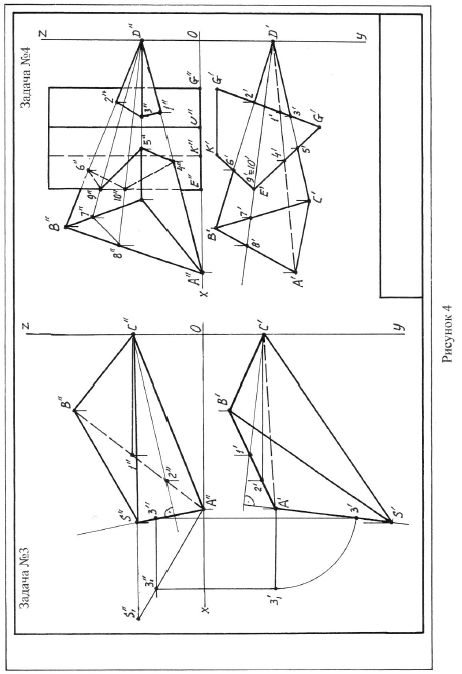 Задача 4. По координатам точек из приложения В строятся проекции призмы и пирамиды. Так как грани призмы занимают горизонтально- проецирующее положение, то горизонтальная проекция линии пересечения поверхностей совпадает с горизонтальной проекцией призмы. Поэтому отмечаем точки 1,2,3,4,5,6 на пересечении ребер пирамиды с гранями призмы. Для построения точек 9 и 10, в которых ребро призмы Е пересекает пирамиду, заключаем эти точки во вспомогательные прямые D7 и D8, строим их фронтальные проекции и на пересечении их с ребром Е находим искомые точки 9 и 10. Соединяем точки линии пересечения с учетом их видимости, учитывая видимость соответствующих граней призмы и пирамиды. Пример выполнения задачи приведен на рисунке 4.