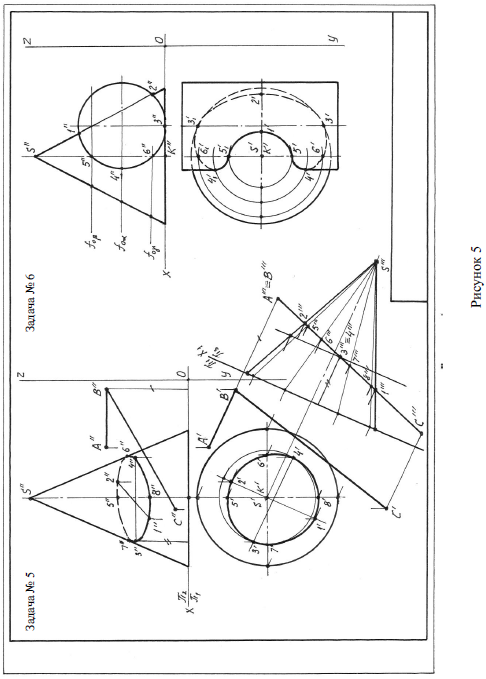 Задача 5. По координатам точек из приложения Г строятся проекции конуса (высота h и радиус R) плоскости, заданной пересекающимися прямыми.. Способом замены фронтальной плоскости проекций p 2 на p 3 переводится секущая плоскость общего положения во фронтально проецирующее. Для этого ось x1 проводится перпендикулярно проекции А’B’ прямой АВ. На плоскости проекций p 3 сечение конуса секущей плоскостью совпадает со следом этой плоскости. По точкам пересечения характерных образующих конуса секущей плоскостью на плоскости проекций p 3 определяются эти точки на образующих конуса на плоскостях проекций p 1 и p 2. Последовательным соединением точек строятся проекции линии взаимного пересечения конуса и плоскости с учѐтом видимости линий. Пример выполнения задачи приведен на рисунке 5.
