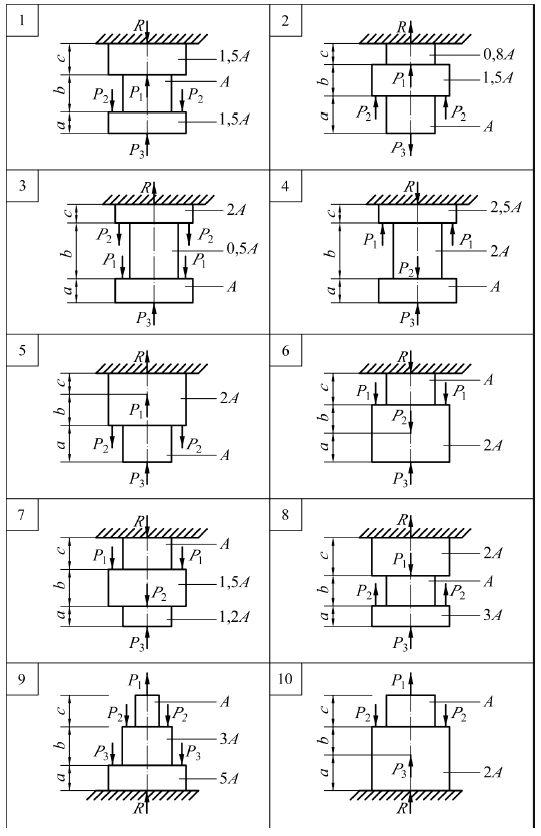 ЗАДАЧА № 1 Растяжение – сжатие. Расчет ступенчатого стержня Для данного стержня требуется: 1. построить эпюру продольных сил – N; 2. построить эпюру нормальных напряжений – σ; 3. построить эпюру перемещений точек, лежащих на оси стержня – Δ. Таблица к задаче № 1