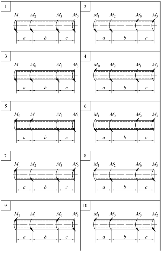 ЗАДАЧА № 3 Кручение. Расчет вала круглого поперечного сечения Стальной вал трубчатого сечения равномерно вращается со скоростью n об/мин и находится под действием четырех скручивающих внешних моментов, соответствующих передаваемым мощностям N0, N1, N2, N3. Требуется: 1. определить скручивающие моменты M0, M1, M2, M3; 2. построить эпюру крутящих моментов MK; 3. определить наружный D и внутренний d диаметры полого вала ( a = d/D ) из условия прочности по заданному допускаемому напряжению [τ] и из условия жесткости, если допускаемый относительный уровень закручивания 4. построить эпюру углов закручивания, приняв левый торец вала за неподвижный; 5. исследовать напряженное состояние элемента, расположенного на поверхности вала в окрестности точек первого участка. Таблица к задаче № 3