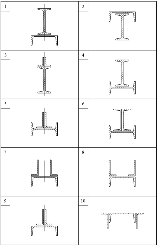ЗАДАЧА № 4 Геометрические характеристики поперечных сечений стержней Для заданного поперечного сечения стержня, составленного из прокатных профилей, определить величины главных центральных моментов инерции. При решении использовать таблицы сортамента проката. Методические указания к решению задачи № 4 1. Вычертить сечение в масштабе 1:2 с указанием на чертеже всех заданных и необходимых для расчета размеров в числах. 2. Определить положение центра тяжести сечения, его координаты показать на чертеже. 3. Провести центральные оси, параллельные сторонам элементов прокатных профилей. 4. Пояснить, почему эти оси являются не просто центральными, а главными центральными осями. 5. Вычислить моменты инерции относительно главных центральных осей. Таблица к задаче № 4
