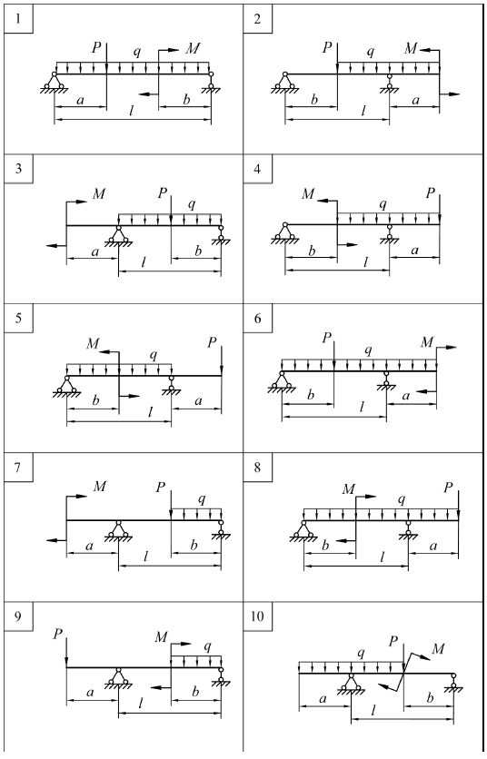 ЗАДАЧА № 6 Прямой изгиб. Расчет балки на прочность Для заданной балки требуется: 1. построить эпюры поперечных сил и изгибающих моментов; 2. подобрать из расчета на прочность по нормальным напряжениям поперечное сечение заданного прокатного или геометрического профиля, если [σ] = 160 МПа; 3. определить максимальные касательные напряжения, возникающие в балке; 4. для сечения балки, в котором поперечная сила и изгибающий момент одновременно достигают максимальных или близких к ним значений, в точке на расстоянии ¼ высоты сечения от верхнего края определить главные напряжения. Таблица к задаче № 6