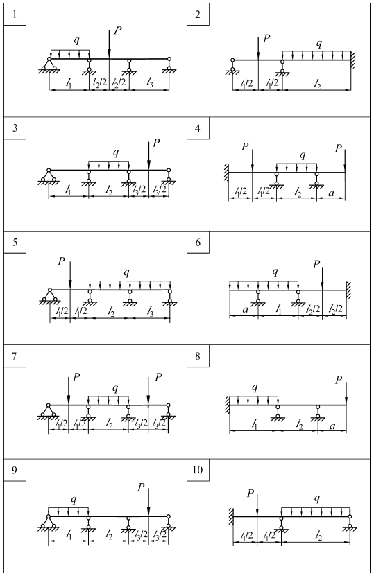 ЗАДАЧА № 7 Расчет статически неопределимой балки методом сил Для заданной балки требуется: 1. изобразить расчетную схему в масштабе, с указанием всех размеров и нагрузок в числах; 2. определить степень статической неопределимости; 3. выбрать основную и эквивалентную системы метода сил; 4. записать систему канонических уравнений метода сил; 5. построить единичные и грузовую эпюры изгибающих моментов; 6. вычислить коэффициенты при неизвестных δij и свободные члены Δip канонических уравнений; 7. решить систему канонических уравнений; 8. построить окончательную эпюру изгибающих моментов М; 9. выполнить деформационную проверку расчета; 10. построить эпюру поперечных сил Q; 11. выполнить статическую проверку расчета; 12. подобрать поперечное сечение балки из условия прочности по нормальным напряжениям в виде прокатного двутавра; 13. определить прогиб в середине первого пролета и проверить жесткость балки (для строителей); 14. определить угол поворота опорного сечения на крайней шарнирной опоре (для механиков). Таблица к задаче № 7