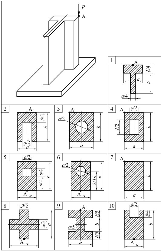 ЗАДАЧА № 10 Расчет колонны на внецентренное сжатие Колонна, поперечное сечение которой задано, нагружена сжимающей силой Р, приложенной в точке А. Требуется: 1. определить положение нейтральной линии; 2. определить наибольшие сжимающие и растягивающие напряжения; 3. построить плоскую эпюру напряжений. Таблица к задаче № 10