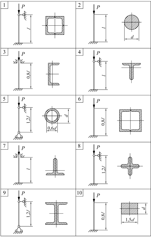 ЗАДАЧА № 12 Расчет прямолинейного сжатого стержня на устойчивость Для стойки заданного сечения, нагруженной продольной силой Р требуется определить: 1. критическую силу Ркр по формуле Эйлера или формуле Ясинского; 2. допускаемую нагрузку Рдоп, используя метод расчета с коэффициентом продольного изгиба φ. 3. коэффициент запаса устойчивости. Таблица к задаче № 12