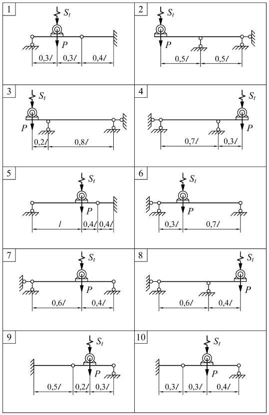 ЗАДАЧА № 14 Расчет балки на свободные и вынужденные колебания На балке, состоящей из двух двутавров, установлен двигатель весом P, делающий n оборотов в минуту. При работе двигателя возникает возмущающая периодическая сила St = S sin qt . Собственный вес балки и силы сопротивления среды не учитываются. Требуется определить: 1. частоты собственных и вынужденных колебаний ω и θ; 2. коэффициент нарастания колебаний β; 3. наибольшее полное нормальное напряжение в балке sполн. = sст.( P) + b×sст.(S ) . Примечание. Если наибольшее полное напряжение получится больше допускаемого [σ] = 160 МПа, то необходимо подобрать другой номер двутавра. Таблица к задаче № 14