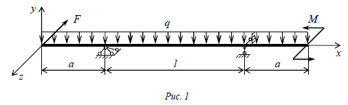 РАСЧЕТНО-ГРАФИЧЕСКАЯ РАБОТА РАСЧЕТЫ НА ПРОЧНОСТЬ СТЕРЖНЯ ПРИ СЛОЖНОМ СОПРОТИВЛЕНИИ. Задача № 1. Балка с поперечным сечением в виде прямоугольника с соотношением размеров h/b=k (h – высота, b – ширина сечения) нагружена силами F, q и моментом M, действующими в вертикальной xy и горизонтальной плоскости xz (рис. 1). Требуется: - изобразить расчетную схему балки; - определить внутренние усилия в поперечных сечениях балки в главных плоскостях xy, xz; - построить эпюры внутренних усилий; - из условия прочности по нормальным напряжениям определить размеры поперечного сечения балки b и h; - проверить выполнение условия прочности по нормальным напряжениям при найденных размерах; - построить эпюру нормальных напряжений σ в опасном сечении. Принять расчетное сопротивление 𝑅 = 200 МПа. Данные для расчета взять из табл. 1 по варианту (шифру), выданному преподавателем. Таблица 1