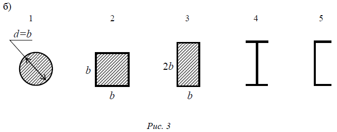 РАСЧЕТ СЖАТОГО СТЕРЖНЯ НА УСТОЙЧИВОСТЬ Задача № 3 . Определить критическую силу и критическое напряжение для центрально-сжатого стержня. Найти допускаемое значение силы F (допускаемую нагрузку). Длину стержня l, способ закрепления концов стержня и коэффициент m (рис. 3, а), форму поперечного сечения (рис. 3, б) выбрать по варианту из таблицы 3. Характеристики материалов приведены в таблице 4. Таблица 3