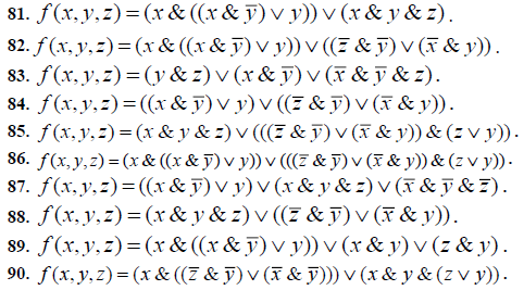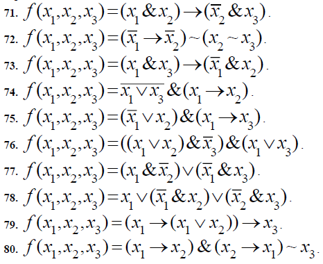 71-80. Булеву функцию f (x1 , x2 , x3) , заданную формулой логики высказываний записать: а) в виде формулы в СДНФ (совершенной дизъюнктивной нормальной форме); б) в виде формулы в СКНФ (совершенной конъюнктивной нормальной форме); в) в виде формулы в минимальной ДНФ (методом минимизирующих карт).