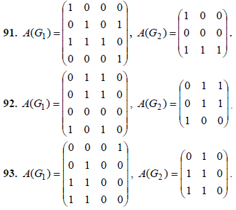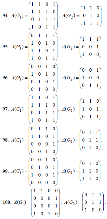 91-100. Графы G1 и G2 заданы матрицами смежности A(G1) , A(G2) .Требуется: а) изобразить графы G1 и G2 , заданные матрицами смежности; б) найти матрицу смежности графа G1 ∪ G2 и изобразить его; в) найти матрицу смежности графа G1 ∩ G2 и изобразить его.